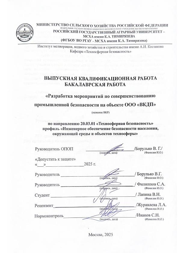 Лапина, В. Н. Разработка мероприятий по совершенствованию промышленной безопасности на объекте ООО "ВКДП": защищена ..2025 / В. Н. Лапина; рук. работы: В. Г. Борулько, С. А. Филиппов; Российский государственный аграрный университет - МСХА имени К. А. Тимирязева [и др.]. — Электрон. текстовые дан. — Москва, 2025. — 122 с. — Коллекция: Выпускные квалификационные работы. — Доступ по паролю из сети Интернет (чтение, печать, копирование). — Режим доступа : http://elib.timacad.ru/dl/local/vkr-k12001.pdf. - Загл. с титул. экрана. - Электрон. версия печ. публикации. — <URL:http://elib.timacad.ru/dl/local/vkr-k12001.pdf>.