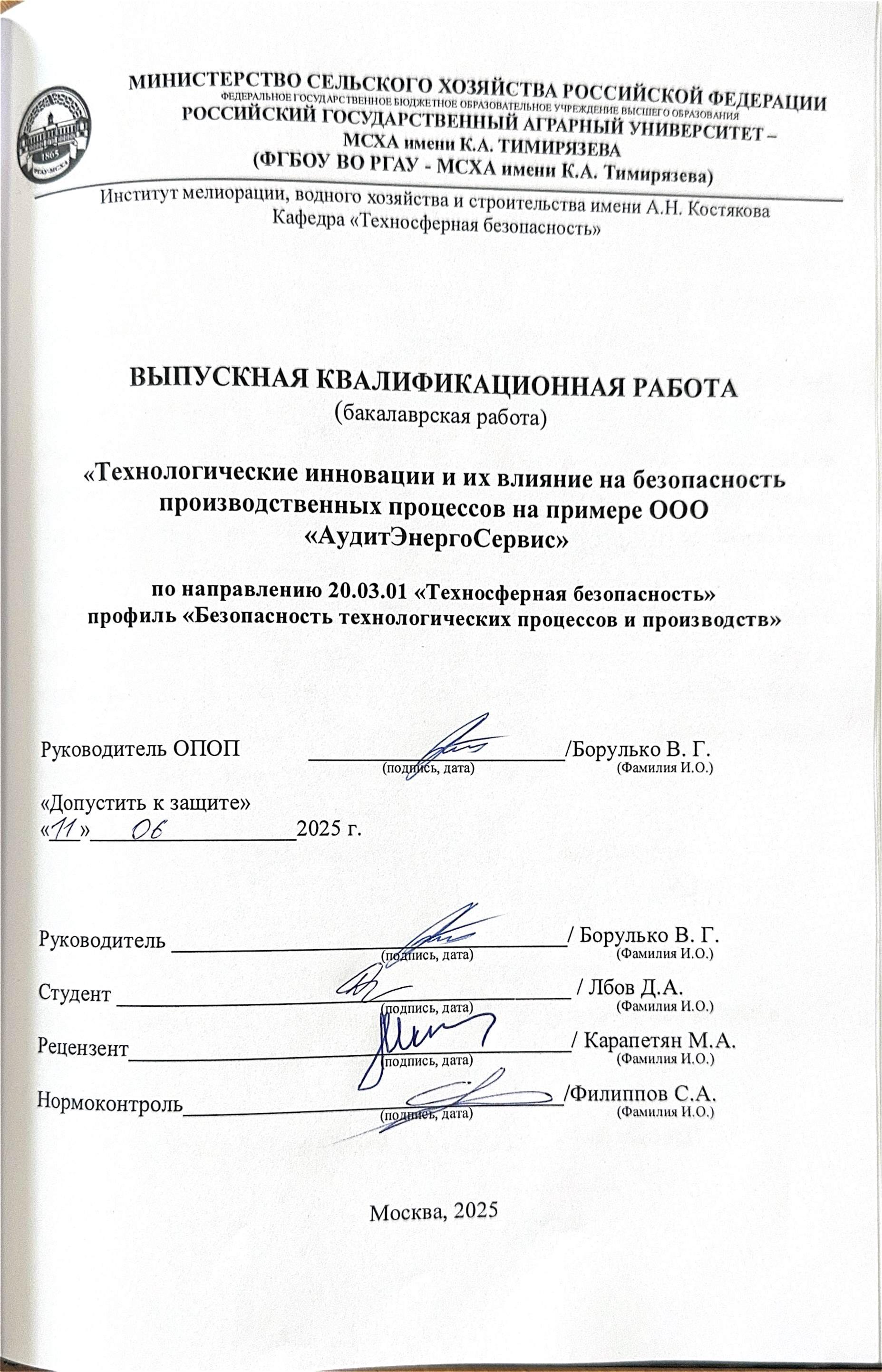 Лбов, Д. А. Технологические инновации и их влияние на безопасность производственных процессов на примере ООО "АудитЭнергоСервис": защищена ..2025 / Д. А. Лбов; рук. работы В. Г. Борулько; Российский государственный аграрный университет - МСХА имени К. А. Тимирязева [и др.]. — Электрон. текстовые дан. — Москва, 2025. — 73 с. — Коллекция: Выпускные квалификационные работы. — Доступ по паролю из сети Интернет (чтение, печать, копирование). — Режим доступа : http://elib.timacad.ru/dl/local/vkr-k12002.pdf. - Загл. с титул. экрана. - Электрон. версия печ. публикации. — <URL:http://elib.timacad.ru/dl/local/vkr-k12002.pdf>.