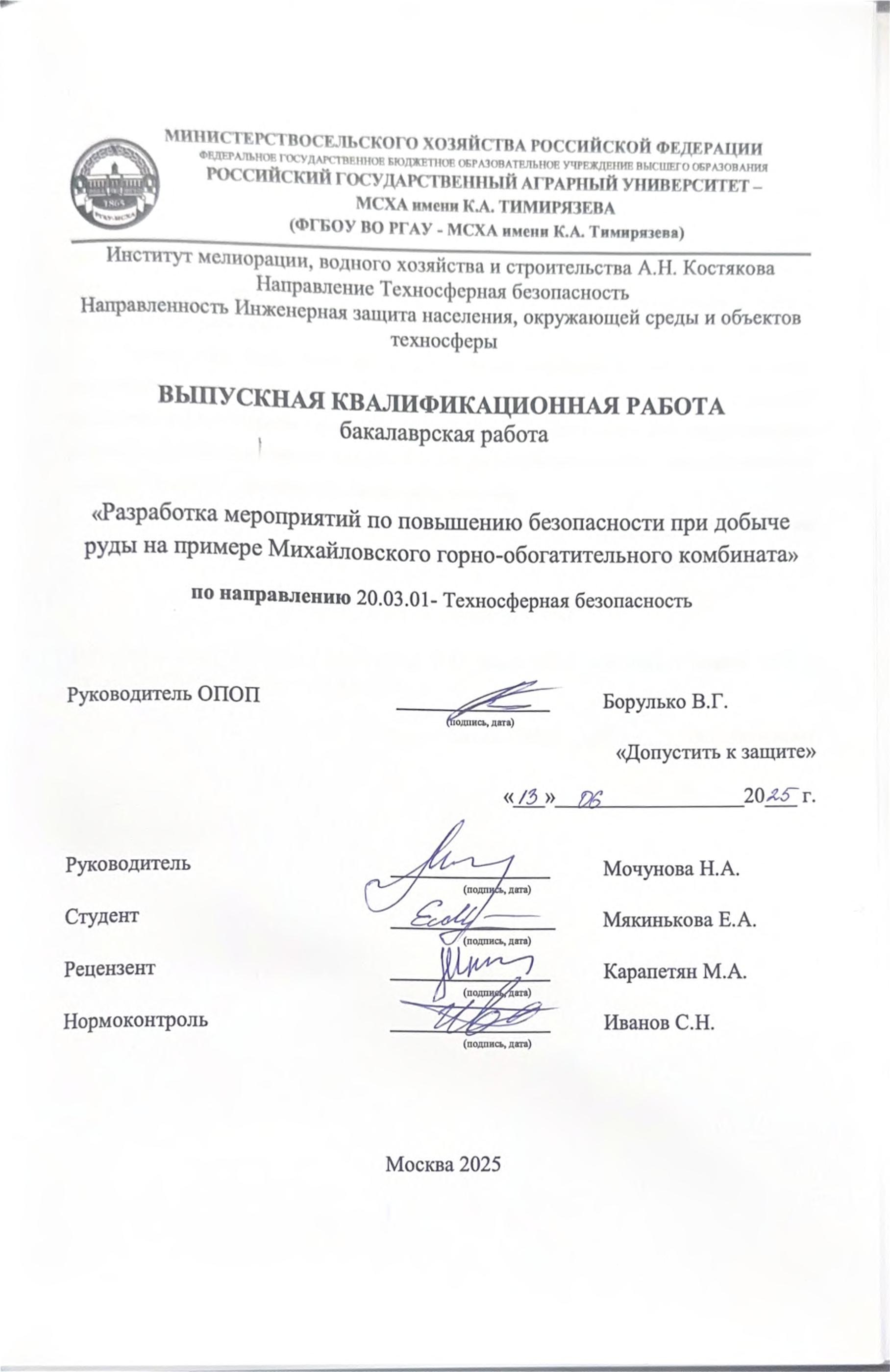 Мякинькова, Е. А. Разработка мероприятий по повышению безопасности при добыче руды на примере Михайловского горно-обогатительного комбината: защищена ..2025 / Е. А. Мякинькова; рук. работы Н. А. Мочунова; Российский государственный аграрный университет - МСХА имени К. А. Тимирязева [и др.]. — Электрон. текстовые дан. — Москва, 2025. — 82 с. — Коллекция: Выпускные квалификационные работы. — Доступ по паролю из сети Интернет (чтение, печать, копирование). — Режим доступа : http://elib.timacad.ru/dl/local/vkr-k12004.pdf. - Загл. с титул. экрана. - Электрон. версия печ. публикации. — <URL:http://elib.timacad.ru/dl/local/vkr-k12004.pdf>.