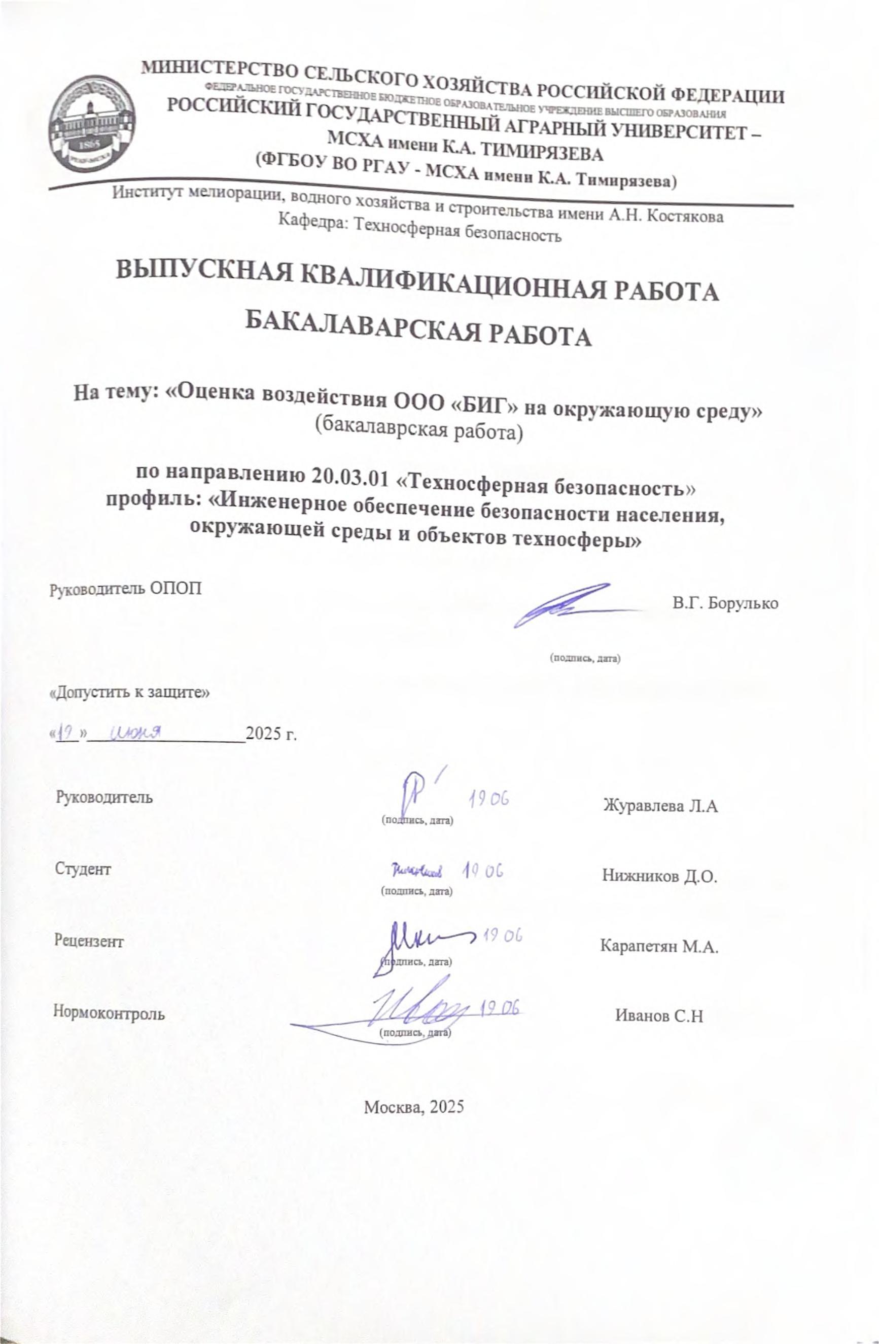 Нижников, Д. О. Оценка воздействия ООО «БИГ» на окружающую среду: защищена ..2025 / Д. О. Нижников; рук. работы Л. А. Журавлева; Российский государственный аграрный университет - МСХА имени К. А. Тимирязева [и др.]. — Электрон. текстовые дан. — Москва, 2025. — 73 с. — Коллекция: Выпускные квалификационные работы. — Доступ по паролю из сети Интернет (чтение, печать, копирование). — Режим доступа : http://elib.timacad.ru/dl/local/vkr-k12006.pdf. - Загл. с титул. экрана. - Электрон. версия печ. публикации. — <URL:http://elib.timacad.ru/dl/local/vkr-k12006.pdf>.