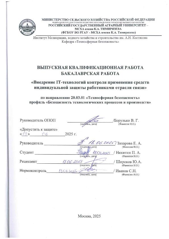 Никитин, П. А. Внедрение IT-технологий контроля применения средств индивидуальной защиты работниками отрасли связи: защищена ..2025 / П. А. Никитин; рук. работы Е. А. Захарова; Российский государственный аграрный университет - МСХА имени К. А. Тимирязева [и др.]. — Электрон. текстовые дан. — Москва, 2025. — 73 с. — Коллекция: Выпускные квалификационные работы. — Доступ по паролю из сети Интернет (чтение, печать, копирование). — Режим доступа : http://elib.timacad.ru/dl/local/vkr-k12007.pdf. - Загл. с титул. экрана. - Электрон. версия печ. публикации. — <URL:http://elib.timacad.ru/dl/local/vkr-k12007.pdf>.