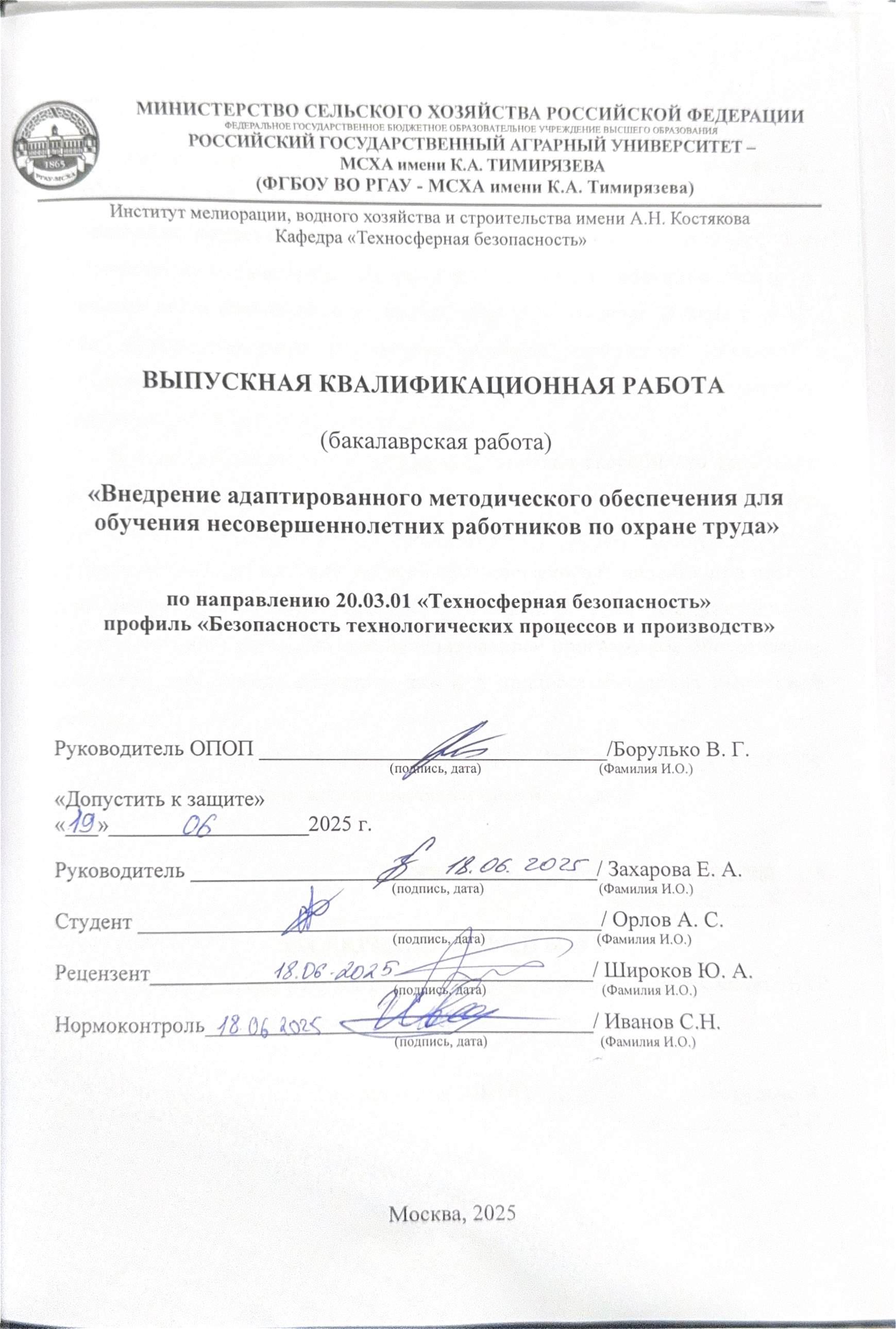 Орлов, А. С. Внедрение адаптированного методического обеспечения для обучения несовершеннолетних работников по охране труда: защищена ..2025 / А. С. Орлов; рук. работы Е. А. Захарова; Российский государственный аграрный университет - МСХА имени К. А. Тимирязева [и др.]. — Электрон. текстовые дан. — Москва, 2025. — 65 с. — Коллекция: Выпускные квалификационные работы. — Доступ по паролю из сети Интернет (чтение, печать, копирование). — Режим доступа : http://elib.timacad.ru/dl/local/vkr-k12008.pdf. - Загл. с титул. экрана. - Электрон. версия печ. публикации. — <URL:http://elib.timacad.ru/dl/local/vkr-k12008.pdf>.