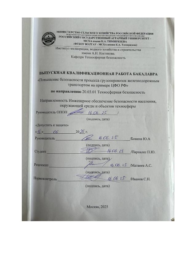 Парпалес, П. Ю. Повышение безопасности процесса грузоперевозок железнодорожным транспортом на примере ЦФО РФ: защищена ..2025 / П. Ю. Парпалес; рук. работы Ю. А. Бовина; Российский государственный аграрный университет - МСХА имени К. А. Тимирязева [и др.]. — Электрон. текстовые дан. — Москва, 2025. — 114 с. — Коллекция: Выпускные квалификационные работы. — Доступ по паролю из сети Интернет (чтение, печать, копирование). — Режим доступа : http://elib.timacad.ru/dl/local/vkr-k12009.pdf. - Загл. с титул. экрана. - Электрон. версия печ. публикации. — <URL:http://elib.timacad.ru/dl/local/vkr-k12009.pdf>.