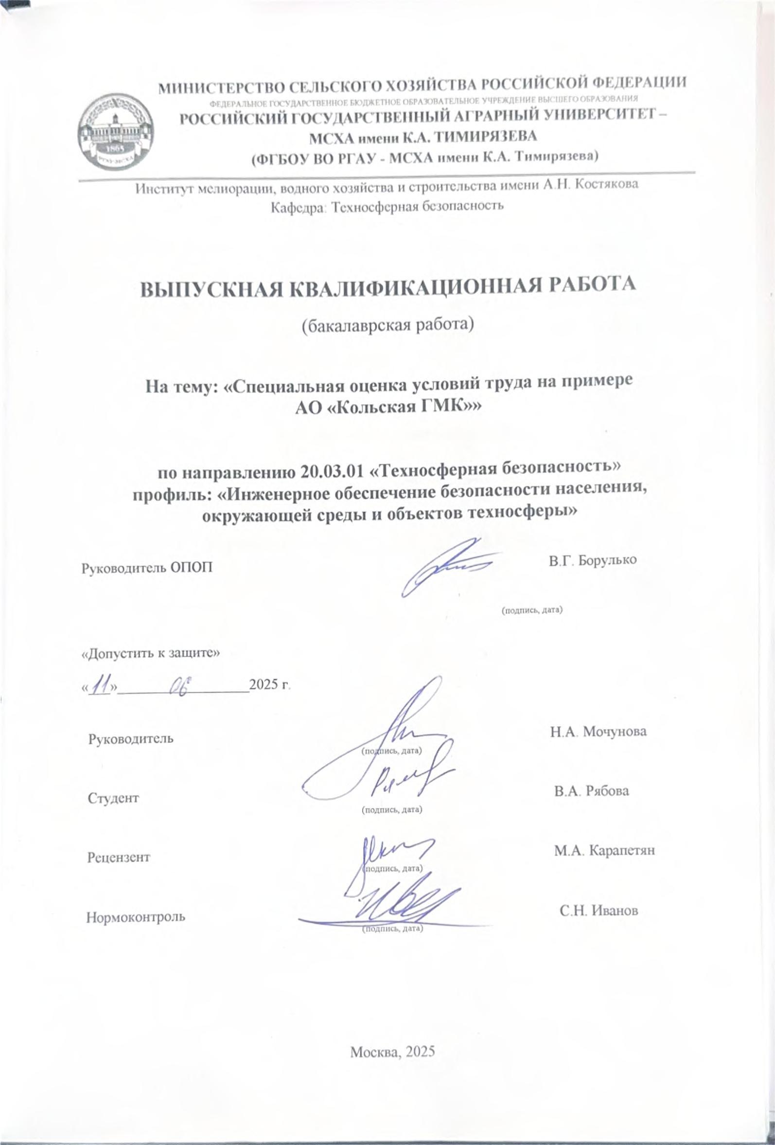 Рябова, В. А. Специальная оценка условий труда на примере АО "Кольская ГМК": защищена ..2025 / В. А. Рябова; рук. работы Н. А. Мочунова; Российский государственный аграрный университет - МСХА имени К. А. Тимирязева [и др.]. — Электрон. текстовые дан. — Москва, 2025. — 86 с. — Коллекция: Выпускные квалификационные работы. — Доступ по паролю из сети Интернет (чтение, печать, копирование). — Режим доступа : http://elib.timacad.ru/dl/local/vkr-k12013.pdf. - Загл. с титул. экрана. - Электрон. версия печ. публикации. — <URL:http://elib.timacad.ru/dl/local/vkr-k12013.pdf>.